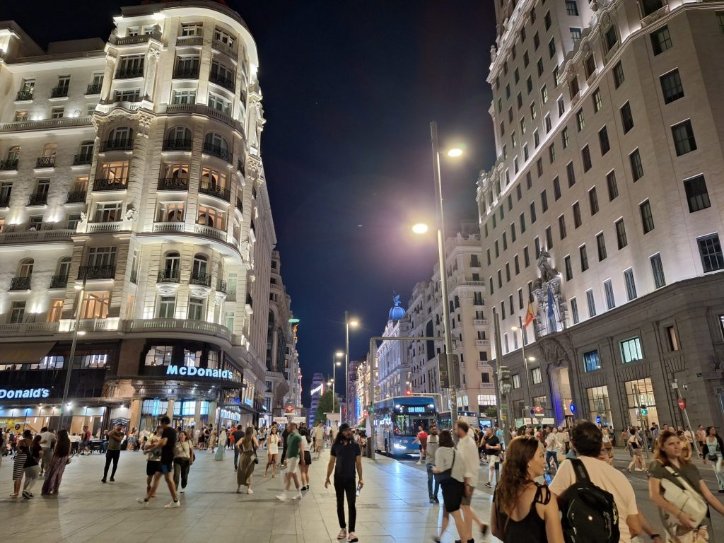 Lebhaftes und buntes Treiben in der Nähe der Puerta de Sol in Madrid bei Nacht